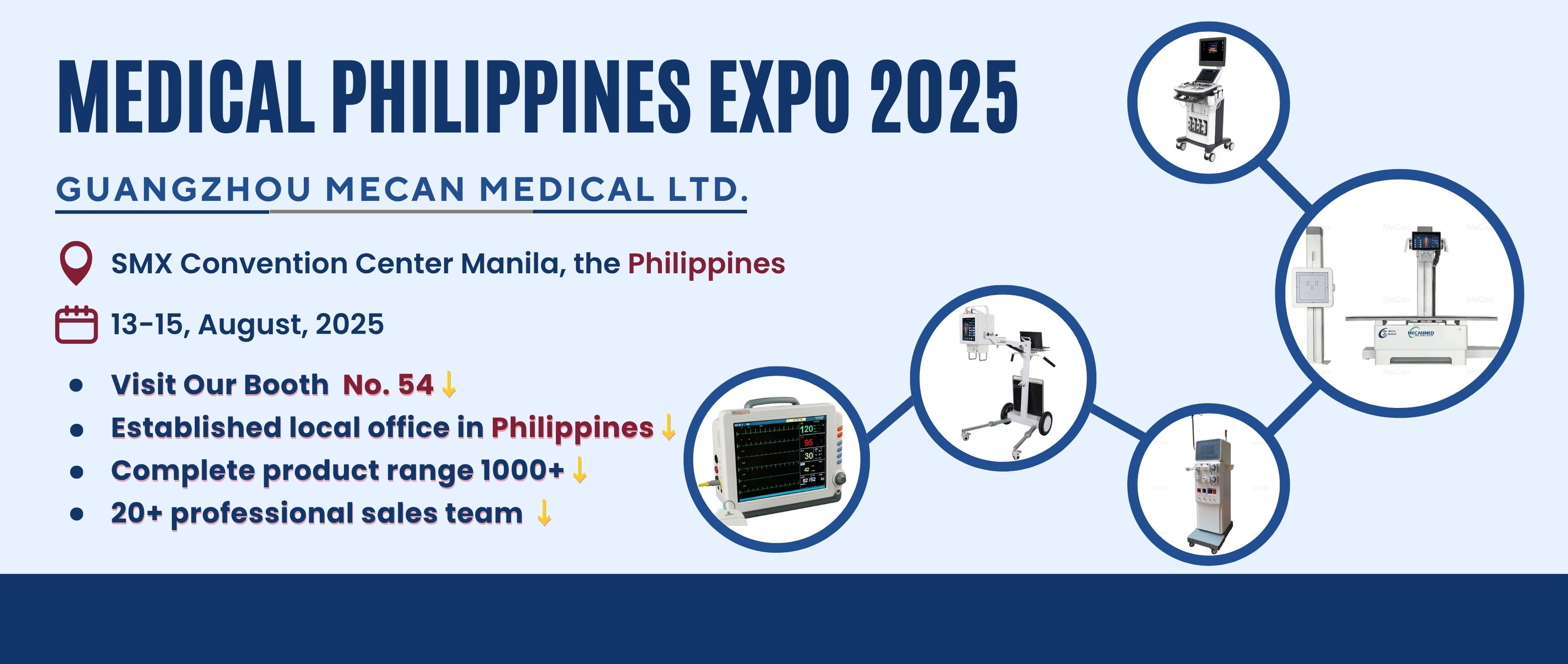 Manila, the Philippines — 13-15 August, 2025 — Booth No.54, Guangzhou MeCan Medical Limited is excited to announce its participation in the Medical Philippines Expo 2025, taking place from 13-15 August, 2025, at the SMX Convention Center Manila, the Philippines. As a trusted medical equipment manufacturer serving over 5,000 hospitals worldwide, we invite African buyers, healthcare professionals, and global partners to visit our Booth No.54 to explore the latest diagnostic imaging, dialysis, surgery, and more innovations.