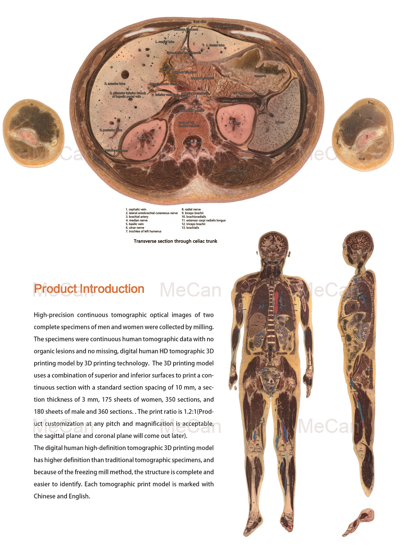 High-precision continuous tomographic optical images of two complete specimens of men and women were collected by milling. The specimens were continuous human tomographic data with no organic lesions and no missing, digital human HD tomographic 30 printing model by 3D printing technology. The 3D printing model uses a combination of superior and Inferior surfaces to print a continuous section with a standard section spacing of 10 mm, a section thickness of 3 mm, 175 sheets of women, 350 sections, and 180 sheets of male and 360 sections.. The print ratio is 1.2:1(Product customization at any pitch and magnification is acceptable, the sagittal plane and coronal plane will come out later). The digital human high-definition tomographic 3D printing model has higher definition than traditional tomographic specimens, and because of the freezing mill method, the structure is complete and easier to identify. Each tomographic print model is marked with Chinese and English.
